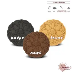 Μπισκότο στρογγυλο με σχήμα αστεράκι και διάμετρο 4,5cm.Διατίθεται σε 3 χρωματισμούς:Λευκό, καφέ ή μαύρο.