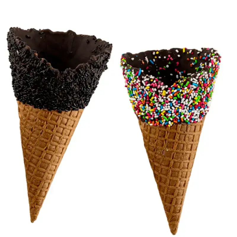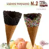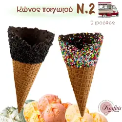 Κώνος παγωτού Ν.2, σε συσκευασία 32 τεμαχίων. Ο κώνος είναι επικαλυμμένος εσωτερικά και εξωτερικά με σοκολάτα και πασπαλισμένος με 2 τρούφες: