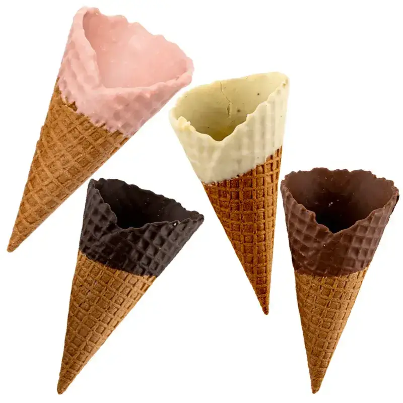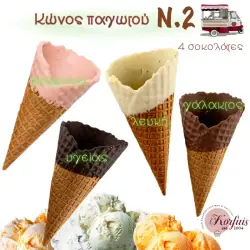Κώνος παγωτού Ν.2, σε συσκευασία 32 τεμαχίων. Ο κώνος είναι επικαλυμμένος εσωτερικά και εξωτερικά με σοκολάτα σε 4 γεύσεις:υγείας, γάλακτος, λευκή και φράουλα.