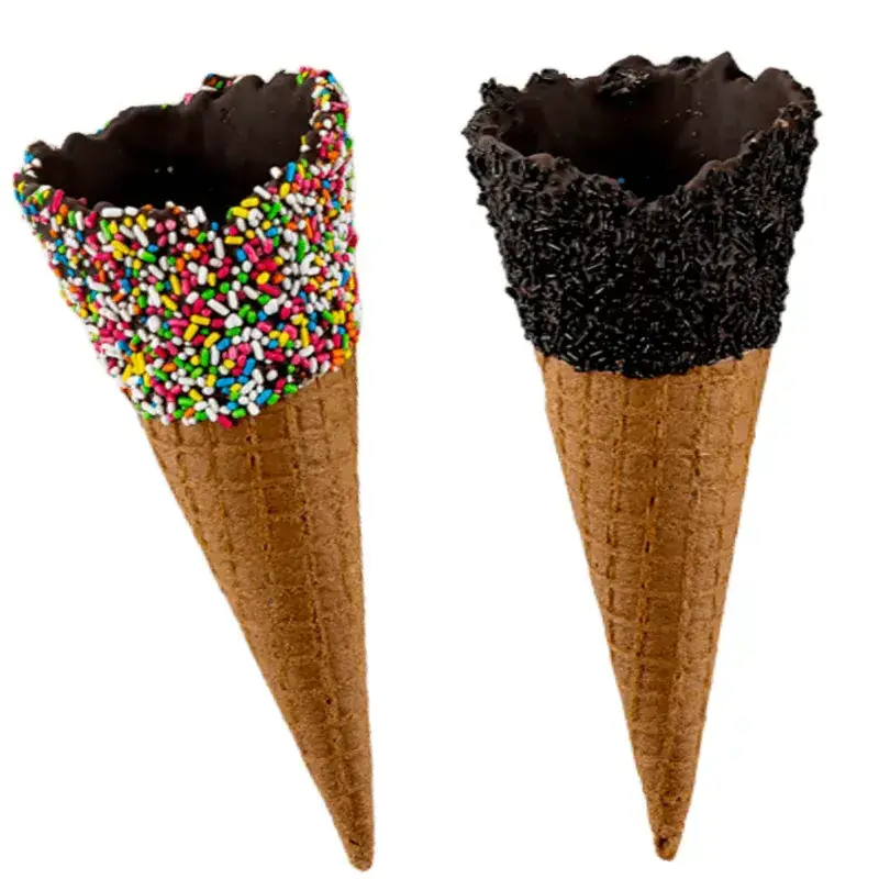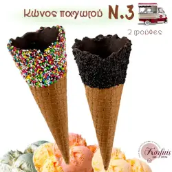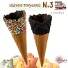 Κώνος παγωτού Ν.3, σε συσκευασία 40 τεμαχίων. Ο κώνος είναι επικαλυμμένος εσωτερικά και εξωτερικά με σοκολάτα και πασπαλισμένος με 2 τρούφες: απλή (απομίμηση) ή πολύχρωμη.