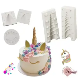 Καλούπι σιλικόνης για την κατασκεύη μονόκερου, σετ 5 τεμαχίων.Αναλυτικά: Βλεφαρίδα 5,3x5cm, μεγάλο αυτί 5x5x1,8cm, μικρό αυτί 5x5x1cm και κέρατο 10x4x3,3cm.