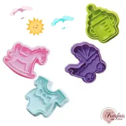 Κουπατ πλαστικά για ζαχαρόπαστα, με διαστάσεις: καρότσι 5x4,5cm, μπιμπερό 5x4cm, αλογάκι 5x4,5 και φορμάκι 4,5x4,5cm.