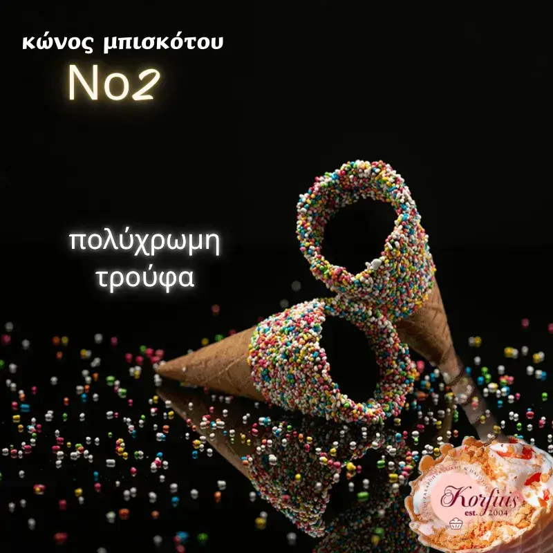 Χωνάκι-κώνος μπισκότου, με χωρητικότητα 2 μπάλες παγωτού. Ο κώνος είναι επικαλυμμένος εσωτερικά και εξωτερικά με απομίμηση σοκολάτας και πασπαλισμένος με τρούφα σε 8 χρώματα :